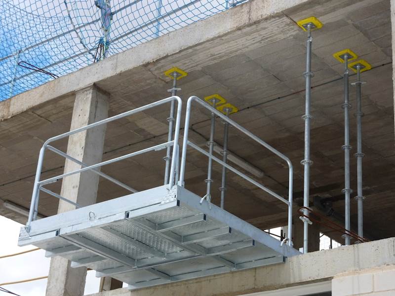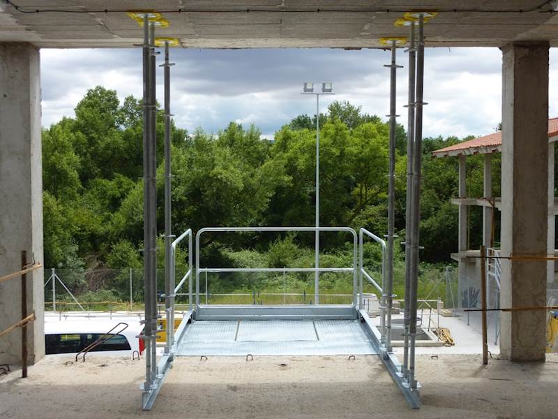 Jeřábová nákladová platforma pro příjem materiálu na stavbách výškových budov. V provedení plná nebo s prostupným otvorem pro pohyb manipulovaného materiálu, v případě umístění plošin nad sebou.